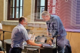 Созопол (3 септември 2023) Българският писател Георги Господинов (дясно), отличен с международната награда "Букър" през месец май тази година, днес се срещна с читатели от град Созопол. Събитието бе част от Празниците на изкуствата "Аполония".