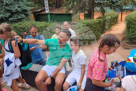 София (14 септември 2023) Пресконференция преди мача България - Казахстан за Купа Дейвис. На снимката: националите по тенис раздават автографи на деца преди срещата на България с Казахстан за Купа Дейвис.