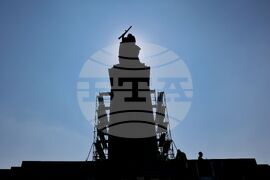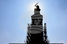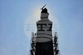 София (18 септември 2023) Работници продължават изграждане на строително скеле около Паметника на съветската армия в Княжеската градина.
