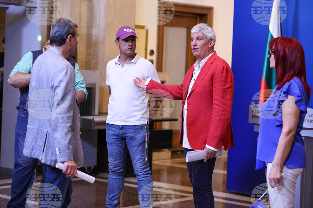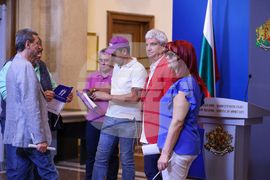 София (19 септември 2023) Брифинг в Министерския съвет след срещата на премиера акад. Николай Денков (вляво) с представителна група на миньорите и енергетиците от протеста „За ясно и сигурно енергийно бъдеще на България“, водена от президента на КНСБ Пламен Димитров (в средата) и президента на КТ „Подкрепа“ Димитър Манолов (вдясно).