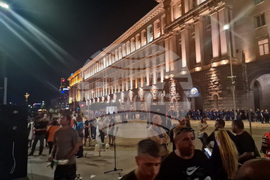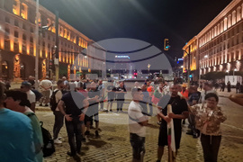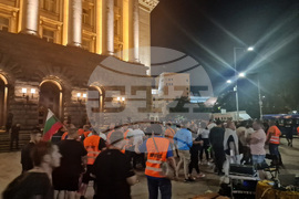София (19 септември 2023) След среща с премиера акад. Николай Денков, финансовия министър Асен Василев и министъра на земеделието и храните Кирил Вътев, представители на протестиращите от сектор "Земеделие" обсъждат следващите си действия. На снимката: протестиращите пред сградата на Министерски съвет. В района има засилено полицейско присъствие.
