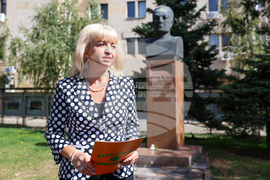 София (23 септември 2023) Обединени земеделци поднасят венци и цветя по повод 76 години от убийството на Никола Петков на паметника му в градинката пред храм „Св. Седмочисленици“. На снимката: председателят на ПП "Обединени земеделци" Петя Ставрева.