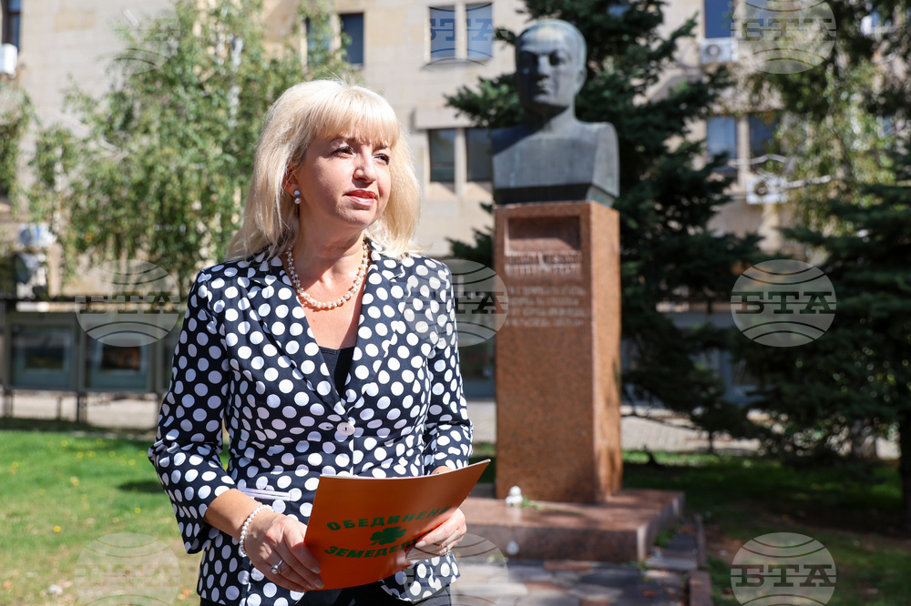 София (23 септември 2023) Обединени земеделци поднасят венци и цветя по повод 76 години от убийството на Никола Петков на паметника му в градинката пред храм „Св. Седмочисленици“. На снимката: председателят на ПП "Обединени земеделци" Петя Ставрева (дясно).