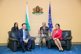 София (24 септември 2023) Парламентарната делегация, водена от председателя на Националното събрание на Социалистическа република Виетнам Въонг Дин Хуе (втори отляво), е на посещение в България. Визитата е по покана на председателя на Народното събрание. Делегацията беше посрещната днес от заместник-председателя на НС Росица Кирова (дясно). Тя разговаря с председателя на парламента на Виетнам и му пожела ползотворен престой в България.