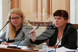 София (28 септември 2023) В сградата на Народното събрание се провежда заседание на Комисията по превенция и противодействие на корупцията. На снимката: председателят на комисията Рая Назарян (ляво), зам.-председателят Сезгин Мехмед (дясно).