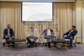 София (10 октомври 2023) Изследването „Икономически центрове в България - 2023" на Института за пазарна икономика (ИПИ), което проучва концентрацията на икономическа активност в страната, се представя в хотел „Интерконтинентал София". На снимката от ляво надясно: мениджър „Развитие проекти" към „Тракия икономическа зона" Владислав Кънчев, членът на УС на Асоциацията за иновации, бизнес услуги и технологии Иван Русев, изпълнителният директор и член на борда на директорите на Automotive Cluster Bulgaria Любомир Станиславов и главният икономист в Института за пазарна икономика Лъчезар Богданов.