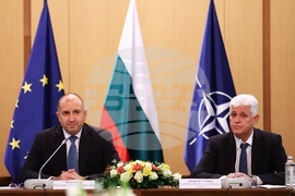 София (6 ноември 2023) Държавният глава и Върховен главнокомандващ на Въоръжените сили Румен Радев открива кръгла маса на тема „Прилагане на достъпни технологии и продукти с голям асиметричен ефект в съвременните конфликти“ в Дом 2 на Резиденция „Бояна“. На снимката: президентът Румен Радев (вляво) и секретарят по сигурност и отбрана на държавния глава Димитър Стоянов (вдясно).