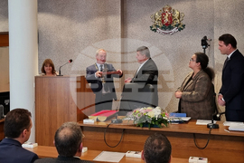 Търговище (8 ноември 2023) В Търговище кметът Дарин Димитров, новоизбраните 33-ма общински съветници и кметове на населени места встъпиха в длъжност. Това се случи на първото заседание за мандат 2023-2027 на Общинския съвет днес, открито от областния управител на Търговище Гергана Цонева. Най-възрастния общински съветник - Хамди Илиязов (втори отляво) от групата на ДПС връчва ключа на града на кмета Дарин Димитров (ляво).