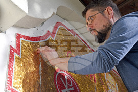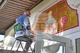 Варна (8 ноември 2023) Иконописецът Младен Костадинов украсява входа на варненската църква „Св. Атанасий".