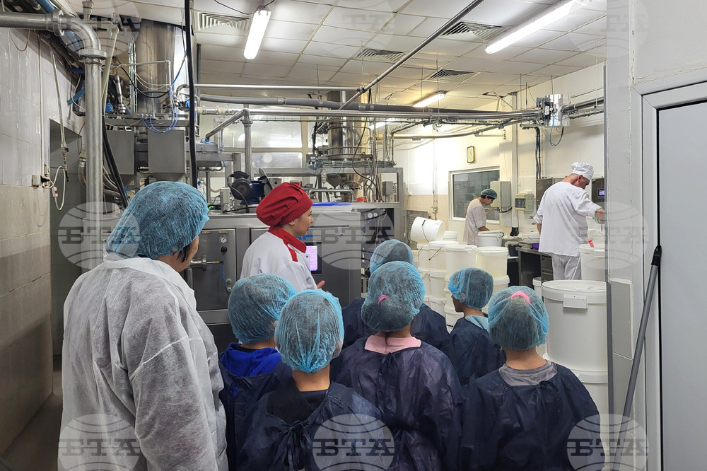 Самоков (9 ноември 2023) В компанията за производство на сладки неща "Си Комерсиал 7" в Самоков се провежда Ден на отворените врати. Учениците от Начално училище "Станислав Доспевски" са на посещение, където могат да видят различни сладкарски изделия, самото производство и машините, които обработват сладкишите. На снимката: ученици от НУ "Станислав Доспевски".