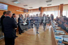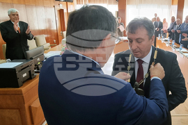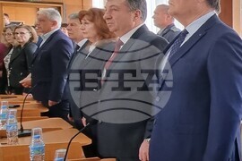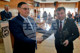 Шумен (10 ноември 2023) Новоизбраният кмет на Шумен Христо Христов (дясно), общински съветници и кметовете на кметства полагат клетва на тържествена сесия на Общинския съвет в областния град.