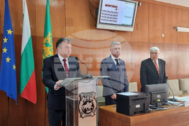 Шумен (10 ноември 2023) Новоизбраният кмет на Шумен Христо Христов, общински съветници и кметовете на кметства полагат клетва на тържествена сесия на Общинския съвет в областния град. На снимката: областният управител на Шумен проф. Добромир Добрев.