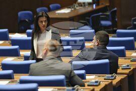 София (16 ноември 2023) В сградата на Народното събрание се провежда заседание на Парламента. На снимката: съпредседателят на „Демократична България“ (ДБ) Атанас Атанасов, депутатът от Възраждане Искра Михайлова.