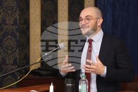 София (16 ноември 2023) В Централния военен клуб се провежда Форум за научни изследвания и иновации в отбраната (Defence Research and Innovation Forum - DRIF). Целта на форума е да се утвърди ролята на научните изследвания и иновации за нуждите на отбраната и да се начертаят ключовите приоритети за адекватно участие на България в инициативите на ЕС и НАТО в областта на иновациите. На снимката: началникът на щаба на ускорителя на НАТО за нови технологии Мориц Цимерман.