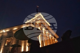 София (17 ноември 2023) Хора с чадъри минават на фона на Народното събрание в дъждовната вечер.
