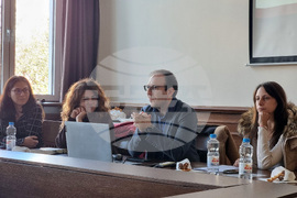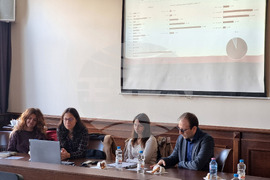 Варна (20 ноември 2023) В Икономическия университет във Варна се провежда заключителна среща по проект за изграждане на мостове между българските читалища и музеи и привличане на нови публики. В него се представят анализи за състоянието на читалищните услуги и мнението на потребителите им за тях, направени от преподавателите от университета гл. ас. Ваня Кралева, гл. ас. Петър Петров и доц. д-р Петя Данкова. За добрите практики на музеите говори Златка Антова от Регионалния исторически музей във Варна. На снимката (от ляво надясно): Петя Данкова, Ваня Кралева, Петър Петров и Златка Антова.