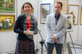 София (22 ноември 2023) В Мраморното фоайе на Народното събрание се открива изложбата „Босилеград в цветове”. Изложбата представя картини на професионални художници от България, Сърбия, Република Северна Македония, Черна гора и Украйна. Творбите са селектирани от трите издания на едноименния художествен пленер в Босилеград от 2021, 2022 и 2023 г. На снимката: депутатът от "ПП - ДБ" Елисавета Белобрадова. и председателят на сдружение „ГЛАС“ Александър Димитров.