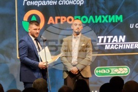 Албена (23 ноември 2023) В курортен комплекс Албена започна единадесетото издание на националния агросеминар на Националната асоциация на зърнопроизводителите. На снимката (от ляво надясно): председателят на НАЗ Илия Проданов и стипендиантът Цветомир Коев.