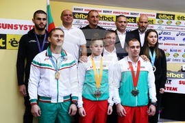 София (28 ноември 2023) В пресклуб България се провежда пресконференция на българската федерация по Самбо. На снимката: световният шампион в категория до 79 килограма на Световното първенство по самбо в Ереван (Армения) Иван Хърков (втори отляво), Анна-Мария Манушева (втора отдясно).