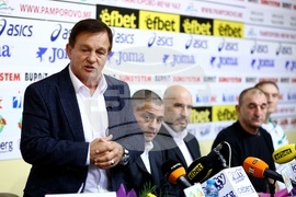 София (28 ноември 2023) В пресклуб България се провежда пресконференция на българската федерация по Самбо. На снимката: Стоян Саладинов (в средата), президентът на българската федерация по самбо Росен Димитров (дясно).