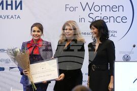 На снимката: Николета Кирчева (вляво), ИОМТ, БАН получи награда от вицепрезидента Йлияна Йотова (в средата).На снимката: генралният директор на L'OREAL-България Ваня Панайотова (вдясно).