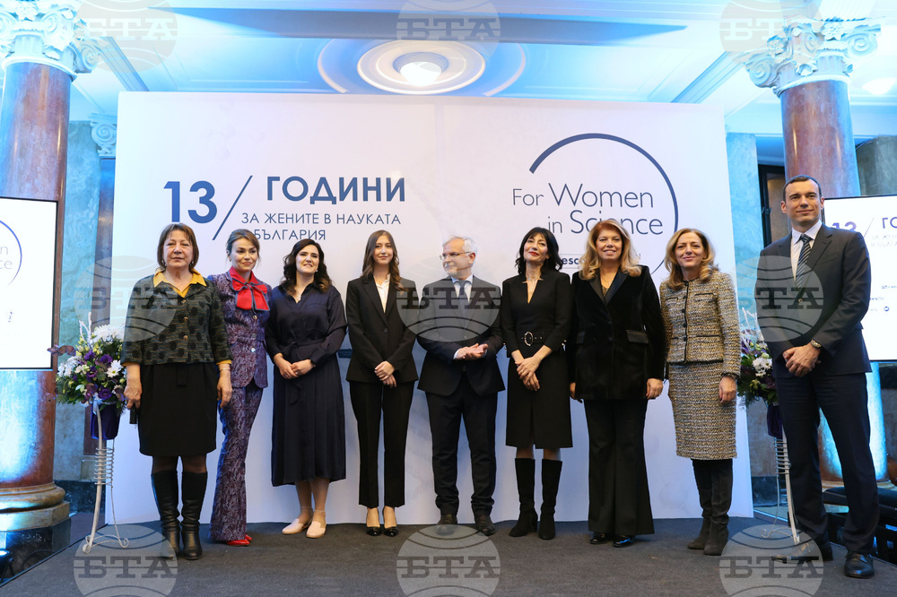 На снимката (от ляво надясно): наградените - Николета Кирчева, ИОМТ, БАН, Росита Кокотанекова, Институт по астрономия, БАН, Росица Паунова, МУ-Пловдив и вицепрезидентът Илияна Йотова, кметът на столицата Васил Терзиев, заместник-министърът на външните работи Елена Шекерлетова.