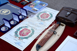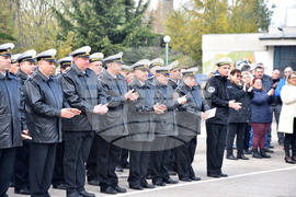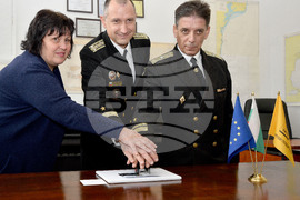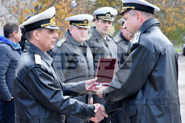 Варна (1 декември 2023) В района на Хидрографската служба на Военноморските сили (ВМС) се проведе тържествено честване по случай 140 годишнина от нейното създаване. Връчиха се награди и отличия на военнослужещи. По-късно валидираха марка, която Български пощи издават специално за празника. На снимката (от ляво надясно): Милена Генчева от Български пощи, кап. първи ранг Николай Николов и флотилен адмирал Георги Пенев.