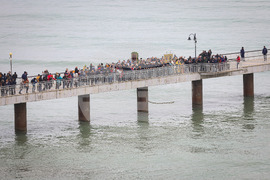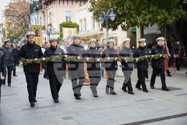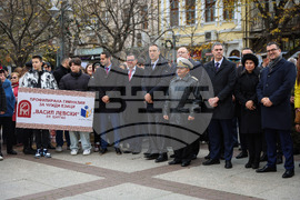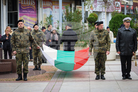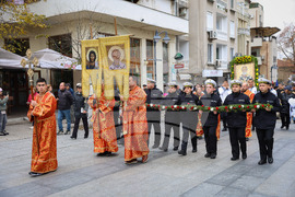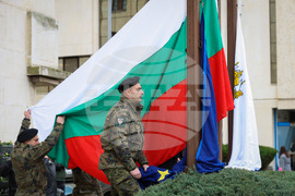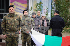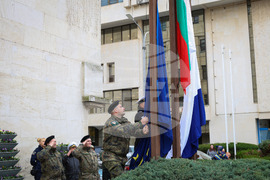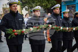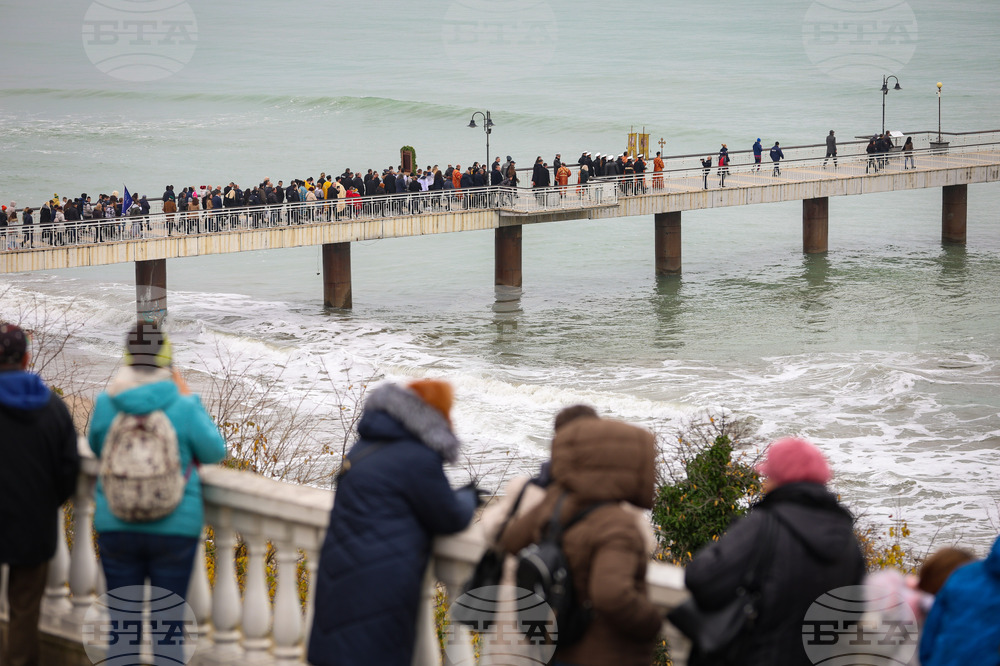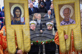 Бургас (6 декември 2023) По повод Никулден, празник на град Бургас, пред сградата на общината се състои тържествено издигане на флаговете. Отслужва се молебен за благоденствие. След това литийно шествие с иконата на св. Николай Чудотворец преминава през улица "Богориди" и стига до моста. Там се хвърлят венци и цветя в морето в памет на загиналите моряци и рибари. На снимката: кметът на Община Бургас Димитър Николов (втори отляво).