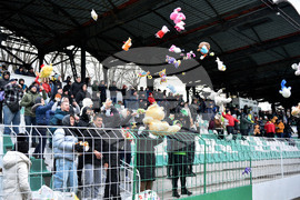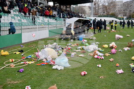 Варна (9 декември 2023) На стадион "Тича" във Варна се играе срещата от 20-ия кръг на efbet Лигата между отборите на Черно море и Славия. На снимката: преди мача, привържениците на Черно море дариха играчки за деца в неравностойно положение, като ги хвърлиха атрактивно на терена.