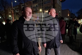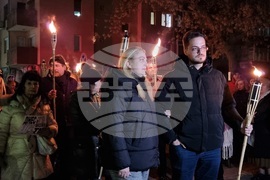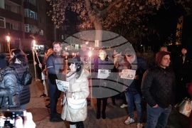 Благоевград (10 декември 2023) Жители на Благоевград се включиха във факелно шествие в подкрепа на жертви на насилие и на жена, нападната пред дома ѝ. Под надслов „Правосъдие на светло: Да спрем насилието над жени!“ тази вечер благоевградчани се събраха на улицата пред дома на Стефка Терзийска, която точно преди два месеца бе нападната с метален прът. В подкрепа на нападнатата жена дойдоха много жители на града, които шестваха от улица „Илинден“, до сградата на Областната дирекция на МВР в Благоевград и оттам до Съдебната палата. Протеста подкрепиха и представители на местната власт, сред които общински съветници от Благоевград, председателят на Общинския съвет Радослав Тасков (ляво) и кметът на Симитли Апостол Апостолов (дясно).