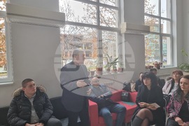 Разград (15 декември 2023) На заключителна пресконференция кметът на Община Разград Добрин Добрев представи резултатите от проекта „Енергийна ефективност и реконструкция на сгради в сферата на културата и изкуството в община Разград“. Събитието се проведе в отдел "Изкуство" на Регионалната библиотека "Проф. Боян Пенев" - един от трите обекта, ремонтирани по проекта. На снимката: директорът на библиотеката Димитър Петров.