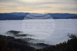 Благоевград (5 януари 2024) Гъста мъгла се стеле през целия ден над Благоевград. На снимката: Изглед към Благоевград от землището на село Делвино.