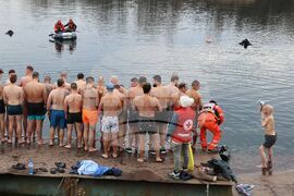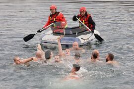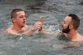 София (6 януари 2024) По традиция кръстът на Богоявление беше хвърлен във водите на езерото в ж.к. „Дружба 1“. Преди това беше отслужен Велик богоявленски водосвет. На снимката: Любомир Мутафчийски спаси кръста.