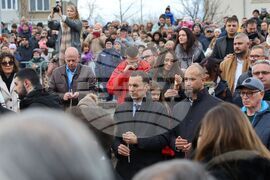 София (6 януари 2024) По традиция кръстът на Богоявление беше хвърлен във водите на езерото в ж.к. „Дружба 1“. Преди това беше отслужен Велик богоявленски водосвет. На снимката: кметът на София Васил Терзиев (трети от дясно наляво) и Ясен Русев(втори дясно), районен кмет на "Искър".