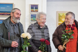 Бургас (6 януари 2024) В галерията на Дружество на бургаските художници се открива изложбата "Богоявление". За 25-та година Йордан Маринов, Йордан Петров и Йордан Ангелов показват съвместна изложба на общия си празник Йордановден. На снимката (от ляво надясно): художниците Йордан Ангелов, Йордан Маринов и Йордан Петров.