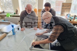 Плевен (12 януари 2024) Десет плевенски фотографи се представят в обща изложба "Светлописи" в Художествена галерия "Илия Бешков". Всеки един от авторите участва с по шест свои фотографии, които най-добре го представят, с акцент върху настоящите му творчески търсения. На снимката (от ляво надясно): Мирослав Григоров, Евгени Дайчев и Лъчезар Костов при подготовката на изложбата, която ще бъде открита официално тази вечер.