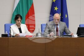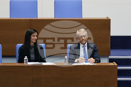 София (12 януари 2024) Заседанието на парламента започва с блицконтрол, в който според правилника на Народното събрание участват премиерът и вицепремиерът. На снимката (от ляво надясно): зам.-председателят на НС Росица Кирова - ГЕРБ-СДС, председателят на Народното събрание Росен Желязков.