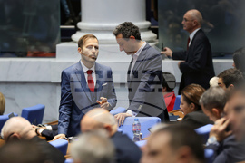 София (12 януари 2024) Заседанието на парламента започва с блицконтрол, в който според правилника на Народното събрание участват премиерът и вицепремиерът. на снимката (от ляво надясно): народните представители от ПП-ДБ Искрен Митев, Даниел Лорер.
