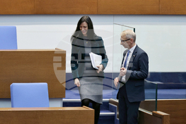 София (12 януари 2024)Заседанието на парламента започва с блицконтрол, в който според правилника на Народното събрание участват премиерът и вицепремиерът. На снимката: заместник министър-председателят и министър на външните работи Мария Габриел, министър-председателят Николай Денков.