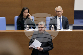София (12 януари 2024) Заседанието на парламента започва с блицконтрол, в който според правилника на Народното събрание участват премиерът Николай Денков (на преден план) и вицепремиерът.