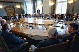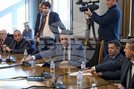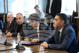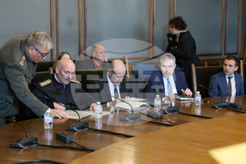 София (12 януари 2024) В сградата на Народното събрание се провежда закрито заседание на Комисията по отбрана съвместно с Комисията по електронно управление и информационни технологии. Точка единствена: изслушване на ръководствата на Министерство на отбраната и Министерство на електронното управление относно плановете за изграждане, разширяване и съвместно ползване на комуникационната инфраструктура и радиокомуникационните системи, в това число Единната електронна съобщителна мрежа на държавната администрация за нуждите на националната сигурност и Стационарната комуникационна система на Българската армия - "Странджа 2". На снимката: председателите на комисиите Христо Гаджев (трети отдясно) и Божидар Божанов (трети отляво).