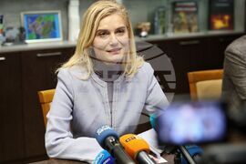 Бургас (12 януари 2023) Министърът на туризма Зарица Динкова дава брифинг в сградата на Община Бургас. Тя коментира старта на „Програма за финансиране на маркетингови дейности на туристически услуги в Черноморските общини в Република България“ и подготовката на летен сезон 2024г. На снимката: