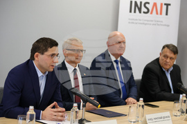 София (15 януари 2024) Министър-председателят акад. Николай Денков присъства на представяне на най-новата разработка в областта на изкуствения интелект на Изследователския институт INSAIT към Софийския университет "Св. Климент Охридски". На снимката (от ляво надясно): изпълнителният директор на INSAIT инж. Борислав Петров, премиерът акад. Николай Денков, проф. Мартин Вечев, научен директор на INSAIT, ректорът на Софийския университет “Св. Климент Охридски” проф. Георги Вълчев.