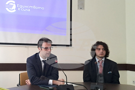 София (19 януари 2024) В сградата на Министерство на финансите, заместник-министърът на Ивайло Яйджиев (ляво) представя победителя в конкурса за избор на лого, слоган и разработване на бранд книга (бранд бук) на кампанията за присъединяването на България към еврозоната. На снимката: победителят Георги Георгиев - Аршата (дясно).