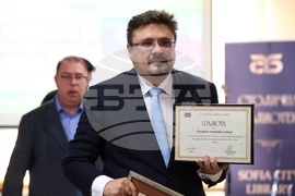 София (22 януари 2024) В Столичната библиотека се провежда церемония по връчване на Деветите „Годишни награди“ Писател на годината & Читател на годината за 2023-та година. На снимката: генералният директор на Българска телеграфна агенция (БТА) Кирил Вълчев (ляво) получава грамота за принос в утвърждаване бранда на Столична библиотека на съвременната културна карта на България от председателят на Държавна агенция „Архиви“ доц. д-р Михаил Груев (в средата).