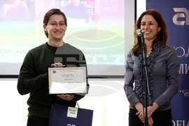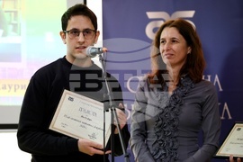 София (22 януари 2024) В Столичната библиотека се провежда церемония по връчване на Деветите „Годишни награди“ Писател на годината & Читател на годината за 2023-та година. На снимката: грамота от Столична библиотека за най-активен читател на научна и научнопопулярна литература получава студентът II курс медицина в СУ „Св. Климент Охридски“ Михаил Лалов.