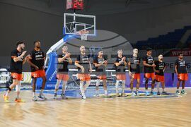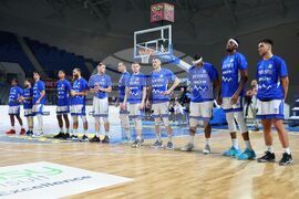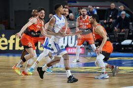 Бургас (15 март 2024) В спортна зала "Арена Бургас" се провежда среща между баскетболните отборите на Рилски спортист и Академик Пловдив. Мачът е четвъртфинал от турнира за efbet Купата на България. На снимката: отборът на Академик Пловдив.