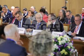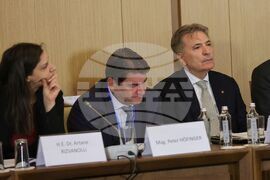 София (22 април 2024) В резиденция Бояна се провежда Виенски икономически форум - Софийска среща 2024 (VIENNA ECONOMIC FORUM SOFIA MEETING 2024), където световни лидери, бизнес експерти и предприемачи обсъждат най-актуалните предизвикателства и възможности пред регионалната и глобална икономика. На снимката: министърът на икономиката на Косово Артан Ризваноли (ляво), служебният министър на икономиката и индустрията Петко Николов (трети отляво).
