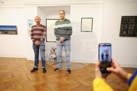 Бургас (23 април 2024) Художникът Божил Божилов (втори отдясно) представя изложба живопис и дигитална графика. Експозицията е под надслов „Полувечност“ и може да се види в галерията на Дружество на бургаските художници на улица „Александровска“ 22. На снимката: председателят на Дружество на бургаските художници Добрин Вътев (вдясно).