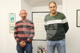 Бургас (23 април 2024) Художникът Божил Божилов (вляво) представя изложба живопис и дигитална графика. Експозицията е под надслов „Полувечност“ и може да се види в галерията на Дружество на бургаските художници на улица „Александровска“ 22. На снимката: председателят на Дружество на бургаските художници Добрин Вътев (вдясно).